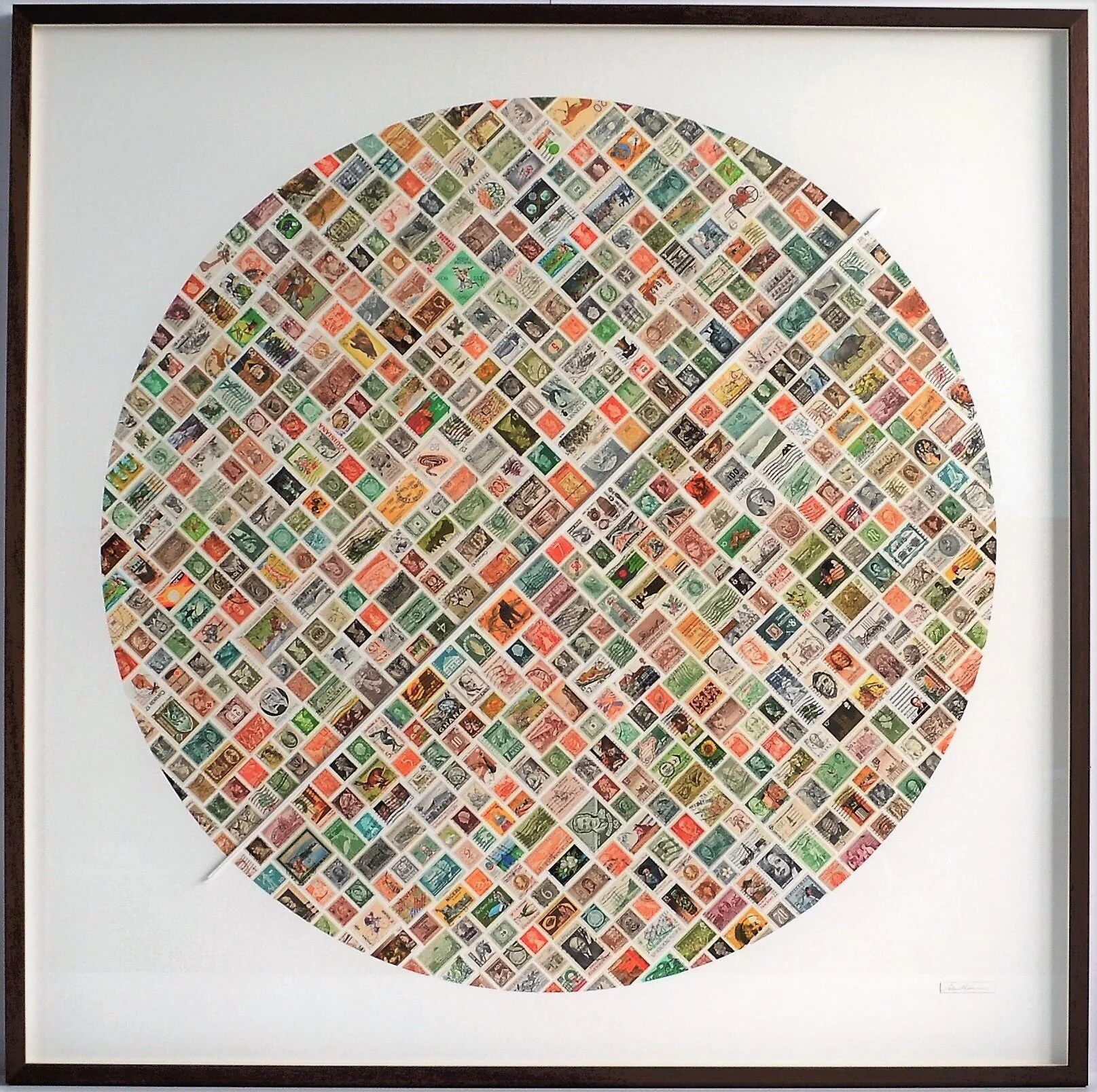 A collection of original, vintage postage stamps and painted wood arranged on canvas with a three-dimensional element. The work is mounted behind conservation glass within a dark brown, wooden frame.