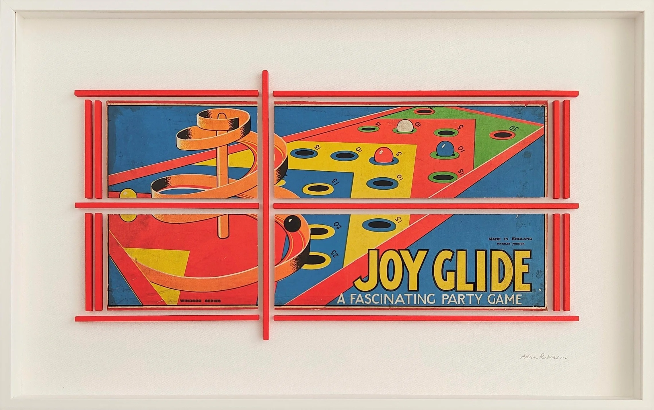 A vintage board game box and painted wood, arranged on canvas with a three-dimensional aspect. The work is mounted behind high quality, non-reflective glass within a white, wooden frame.
