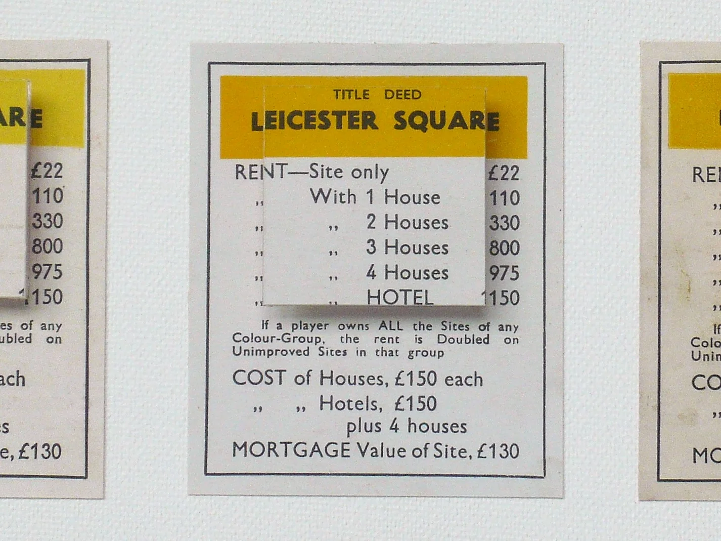 Evoking a sense of nostalgia, these cards have been sourced from British Monopoly sets ranging from the 1930’s to the 60’s. Variations in colour tones between the cards indicate differing ink suppliers and manufacturing processes throughout the years of production.