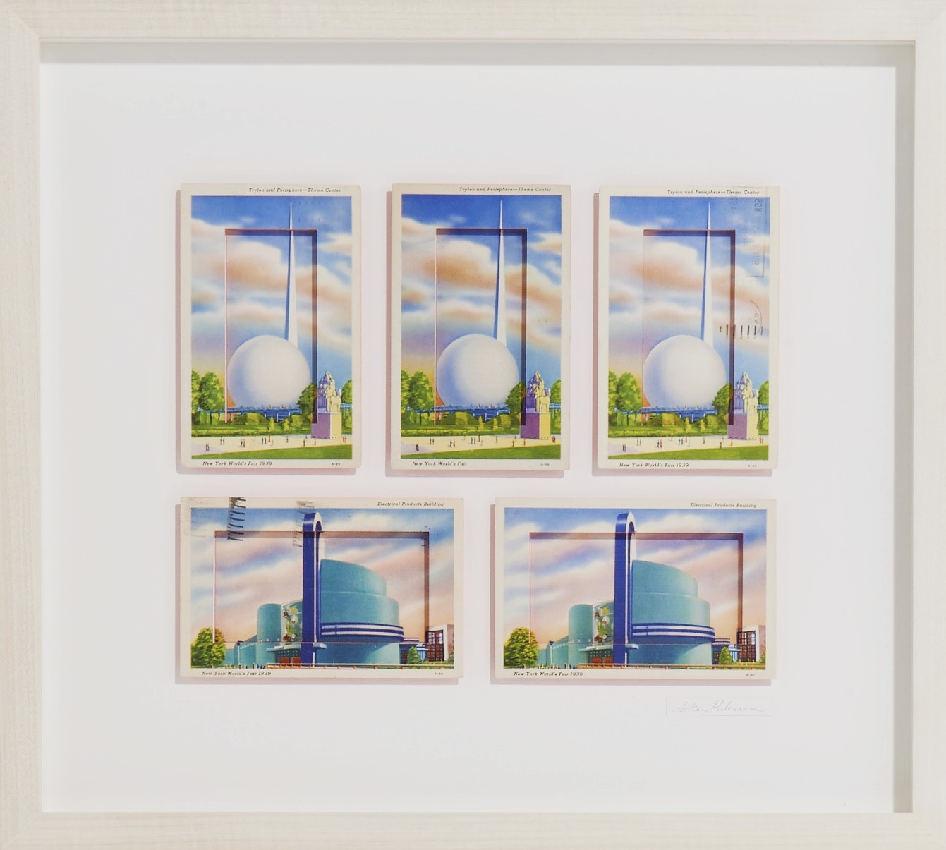 The images depicted in the top row are the iconic and temporary structures, Trylon and Perisphere, designed and built for the New York World’s Fair of 1939. The remaining postcards feature the art deco Electrical Products Building, also at the fair.