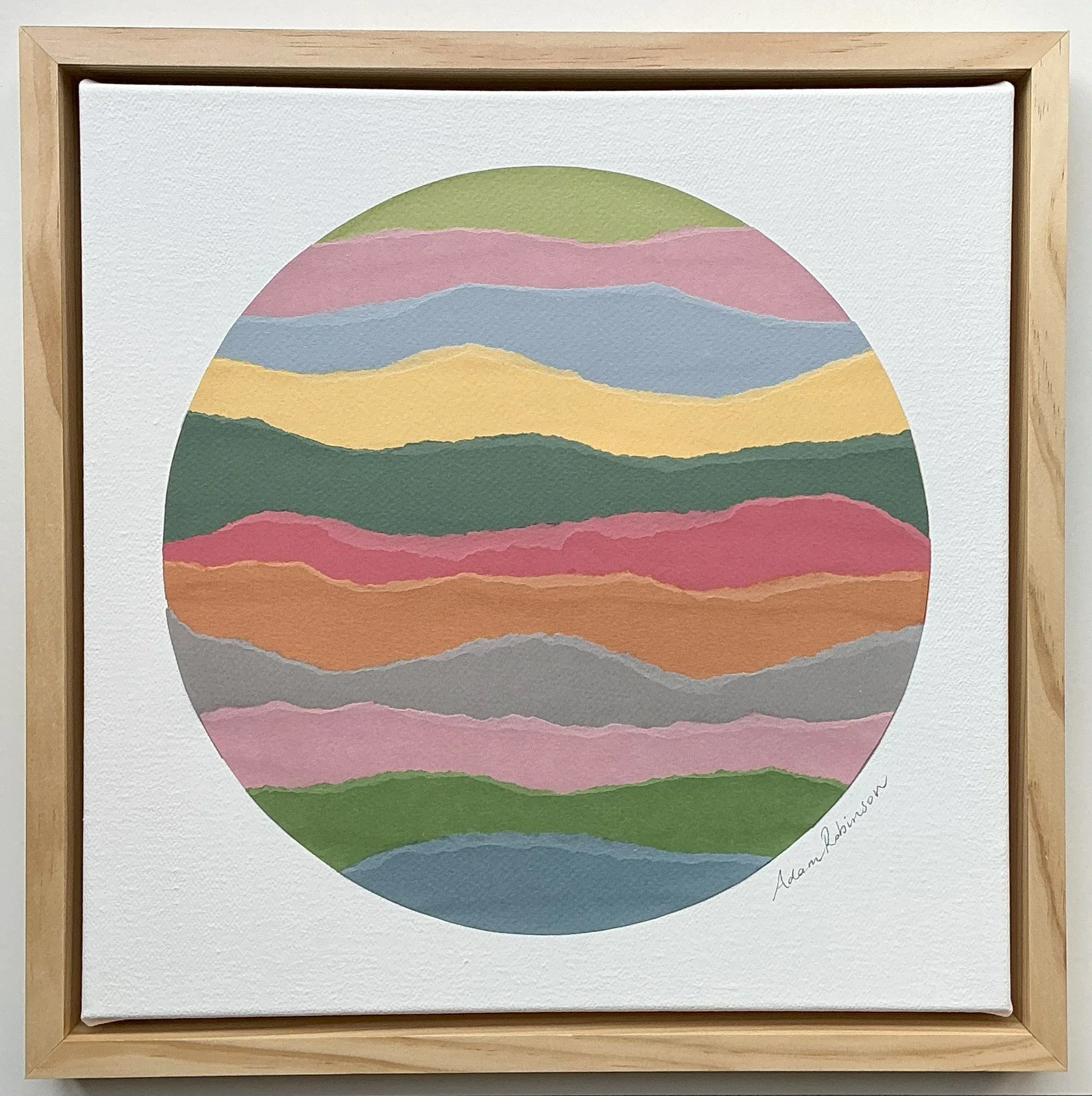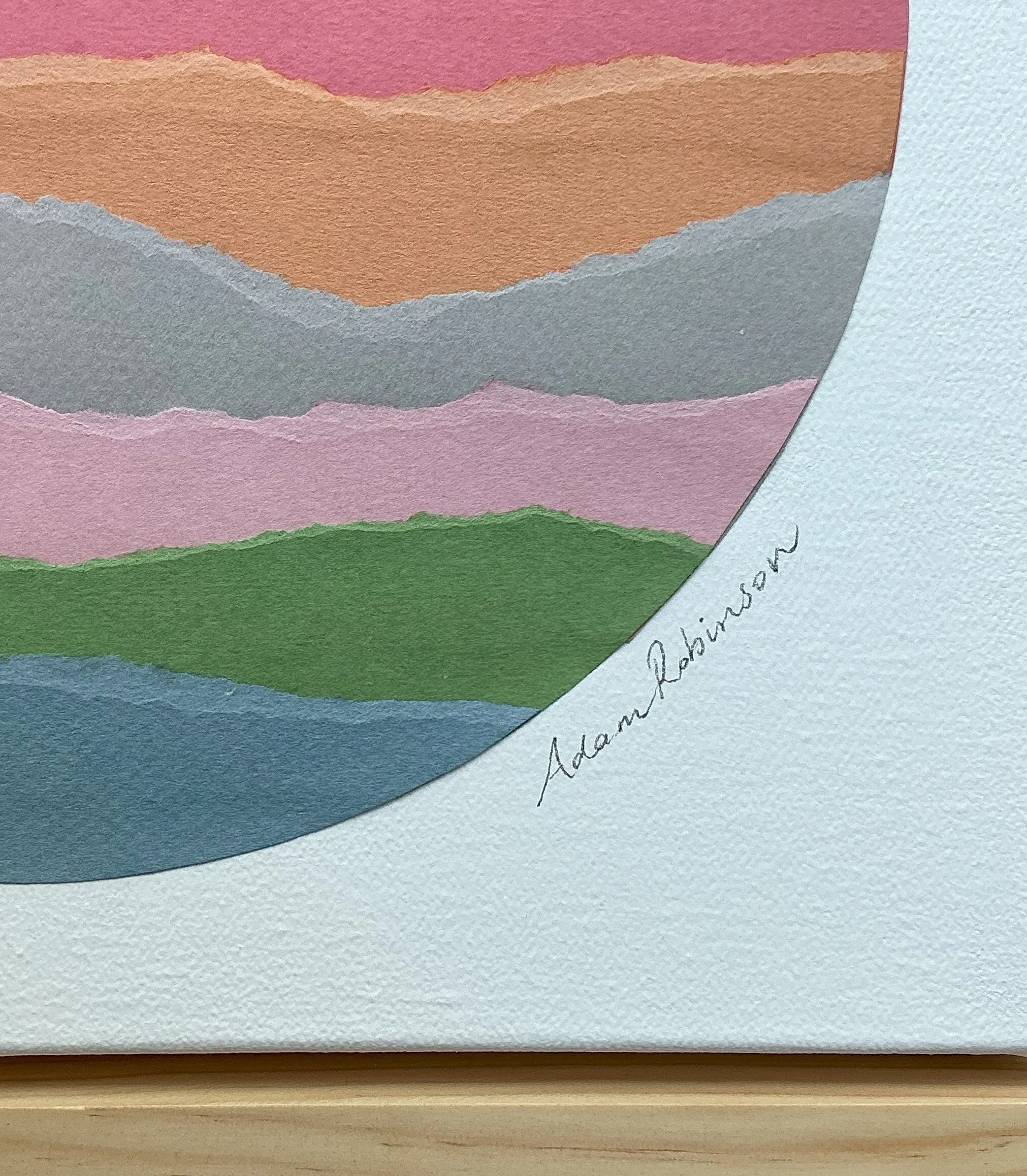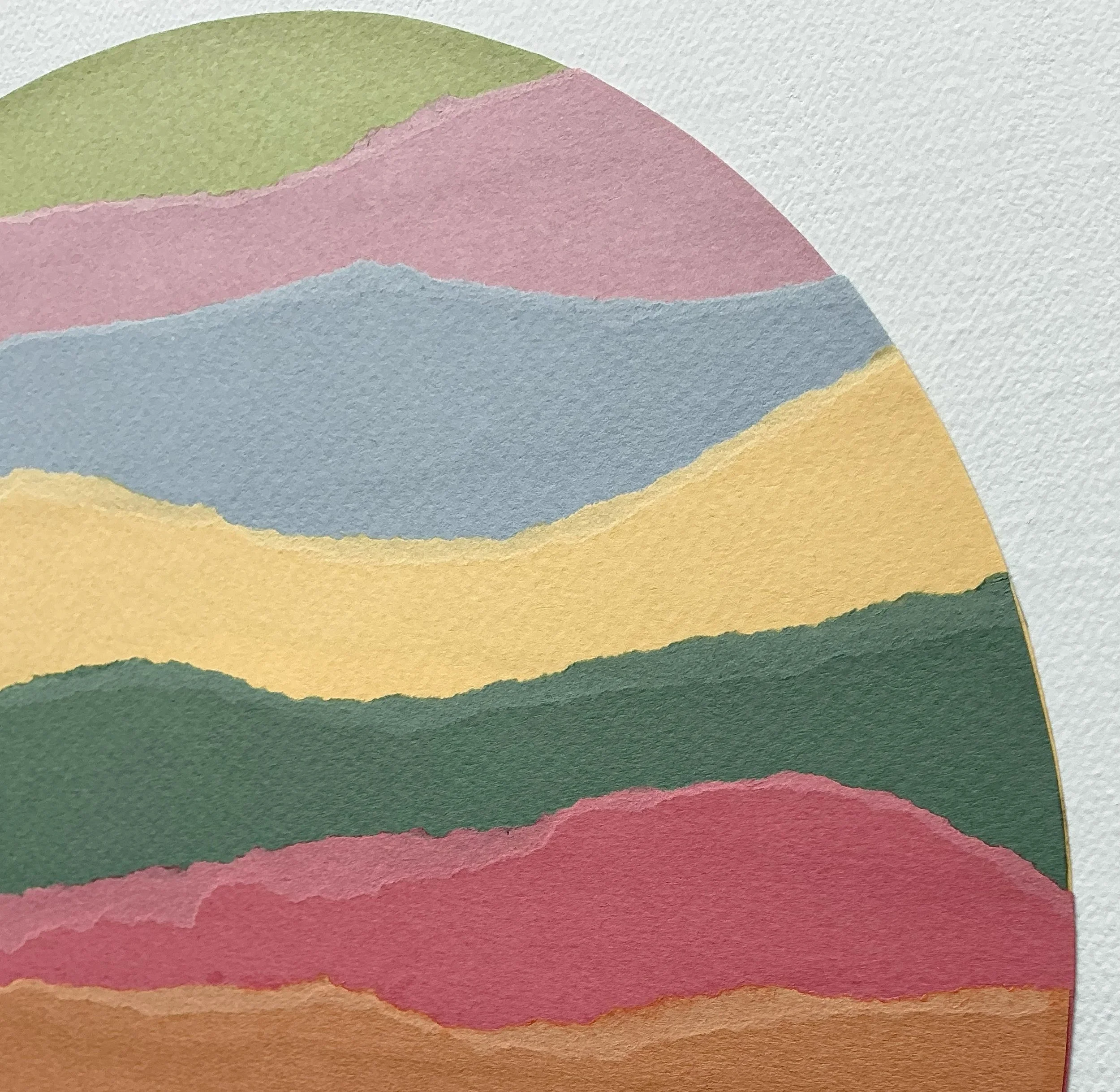 Inspired by the mountains and vibrant colors of a recent trip to Southern California, this original collage artwork captures the serene yet dynamic essence of the landscape. Created by meticulously layering torn, colored cardstock on a painted canvas, the piece evokes the majestic sight of mountain ranges receding into the distance.