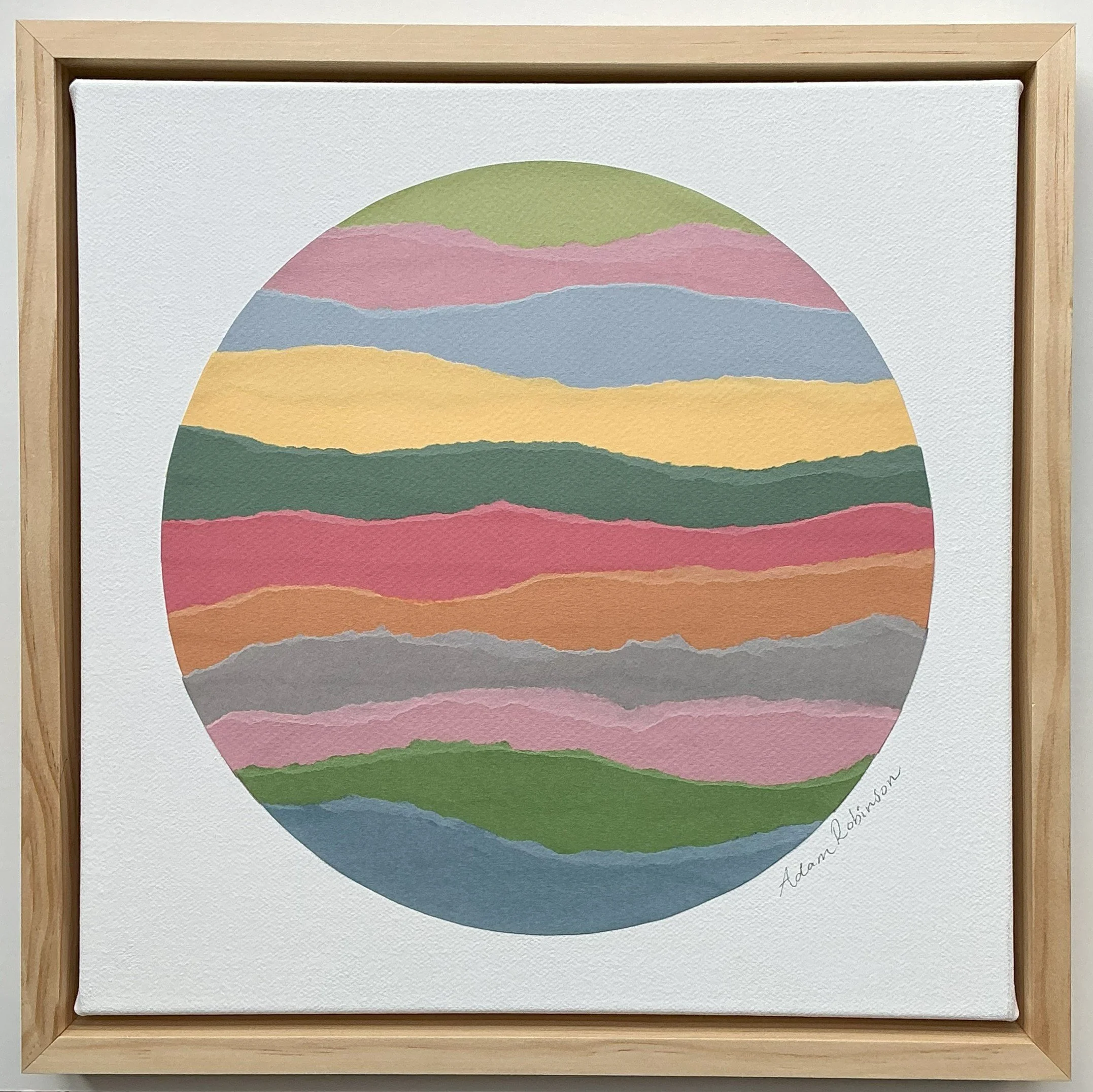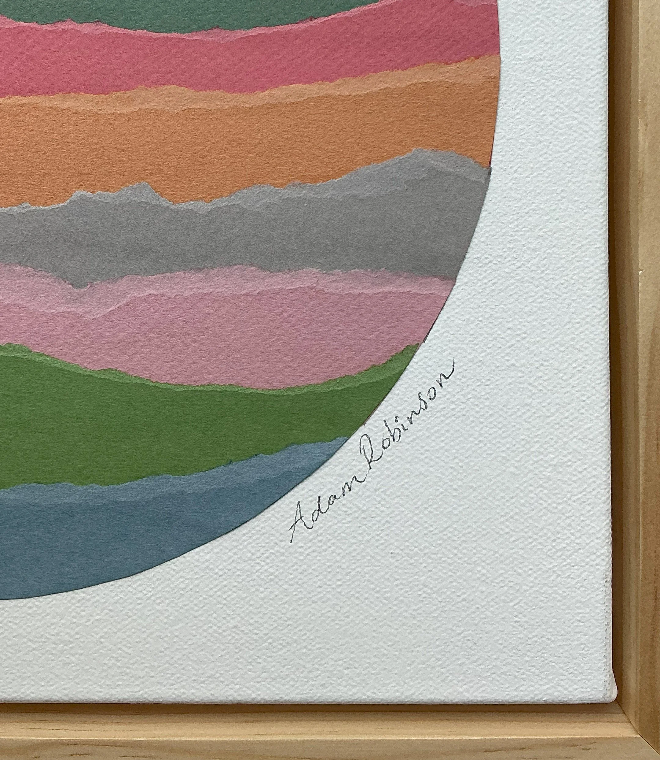 Inspired by the mountains and vibrant colors of a recent trip to Southern California, this original collage artwork captures the serene yet dynamic essence of the landscape. Created by meticulously layering torn, colored cardstock on a painted canvas, the piece evokes the majestic sight of mountain ranges receding into the distance.