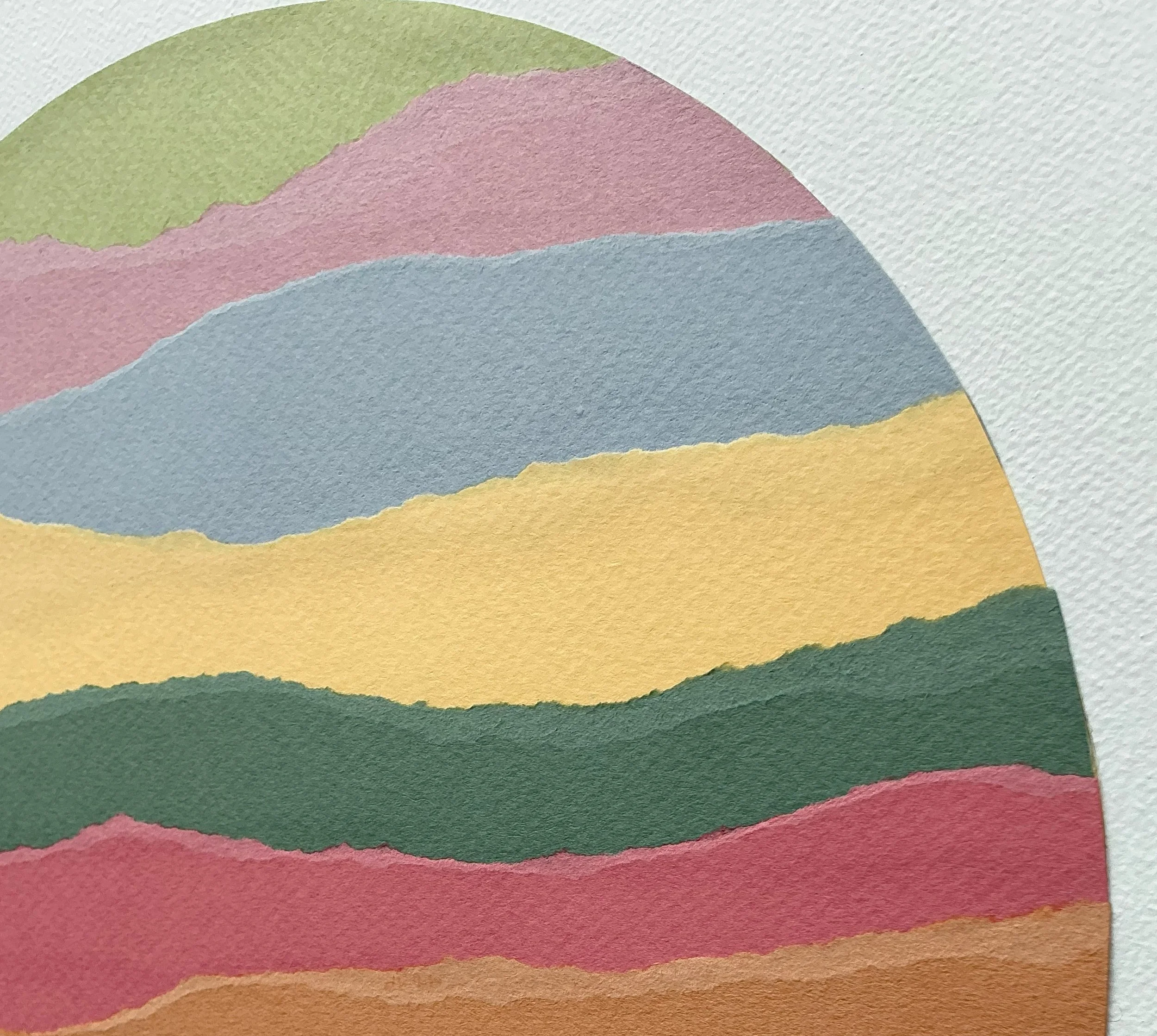 The process of tearing the paper creates beautifully textured edges, each one different, forming organic patterns reminiscent of natural rock formations and distant peaks. I’ve worked with paper in collage form for many years, drawn to the way simple materials can be transformed into something expressive and enduring.