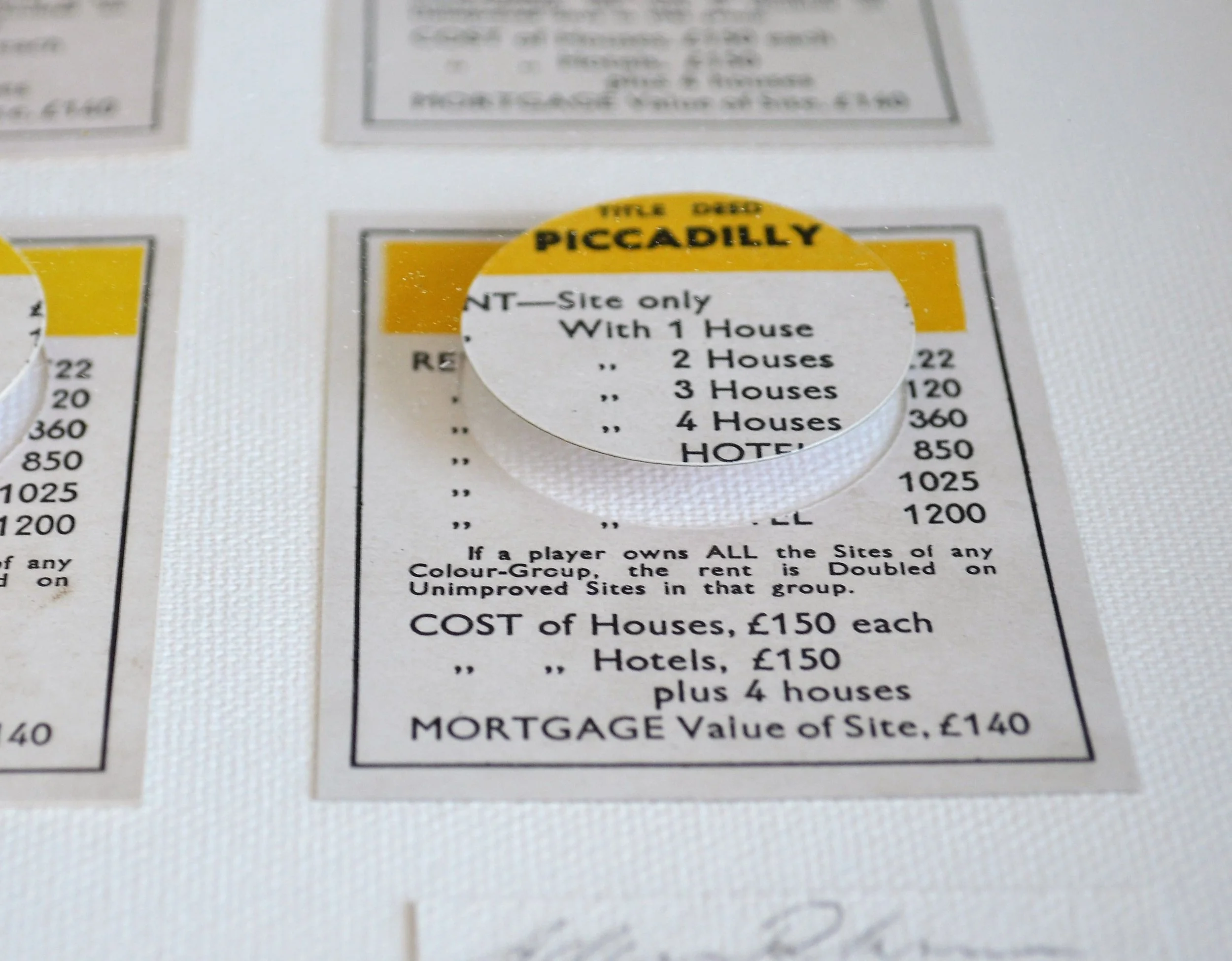Evoking a sense of nostalgia, these cards have been sourced from British Monopoly sets ranging from the 1930’s to the 60’s. Variations in colour tones between the cards indicate differing ink suppliers and manufacturing processes throughout the years of production.