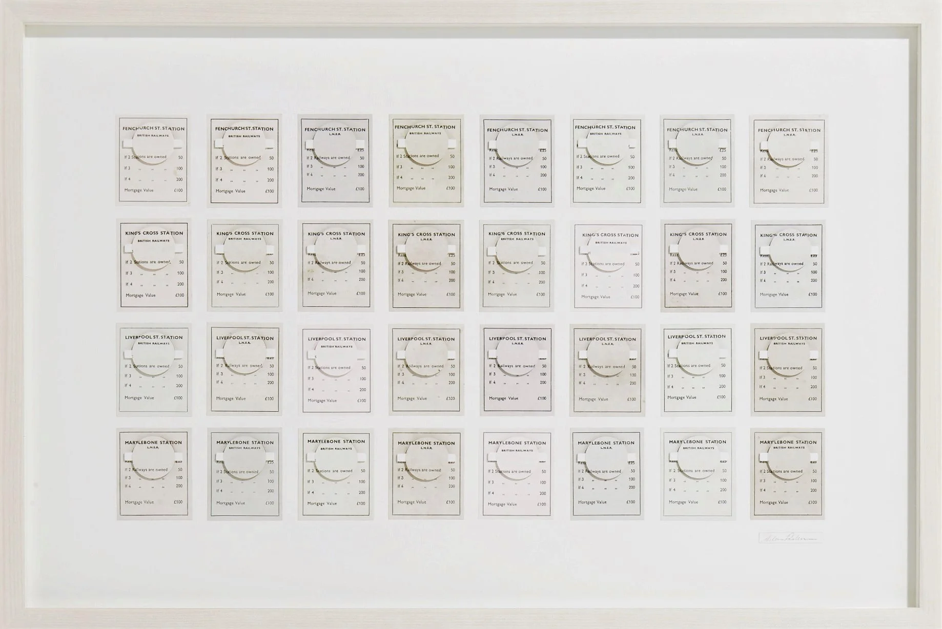 Evoking a sense of nostalgia, these cards have been sourced from British Monopoly sets ranging from the 1930’s to the 60’s. They’ve been arranged into a geometric formation with raised circles and wooden strips that echo the shape of the London Underground logo.