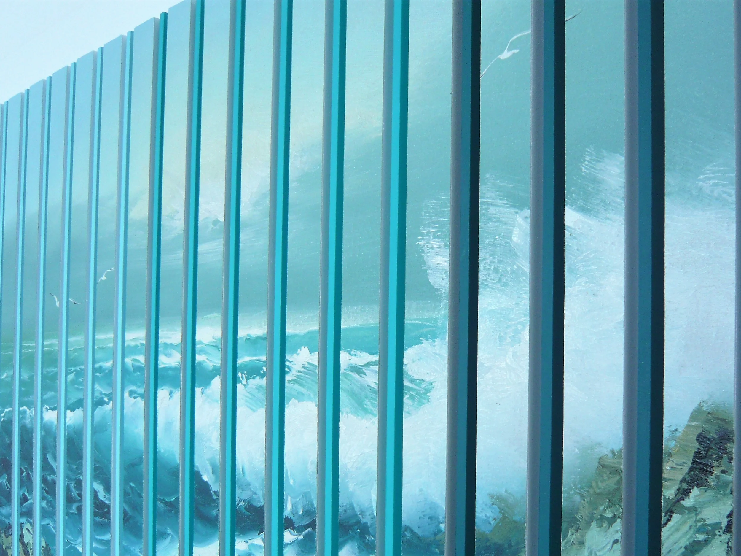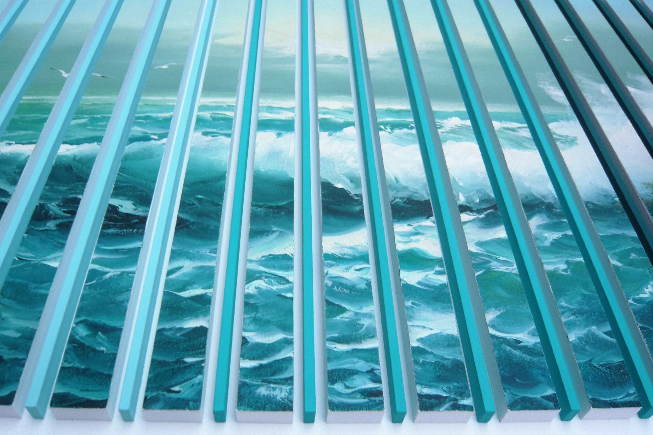 This mid-century find was painted by an unknown artist. It has been divided into sections and then raised on wooden panels. Laser-cut MDF strips, painted in complimentary colours, dissect the ocean scene and create a sense of movement.