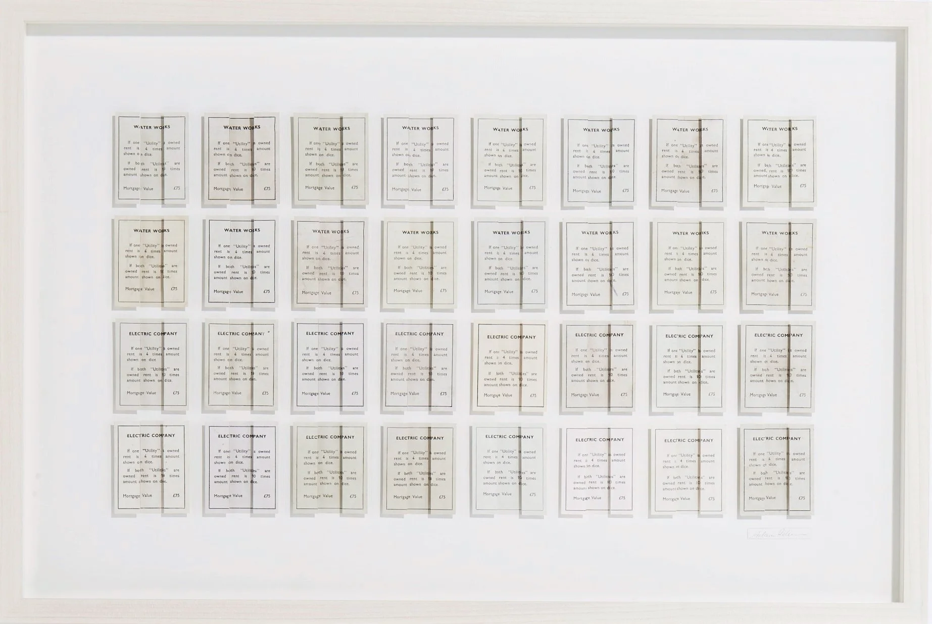 Evoking a sense of nostalgia, these cards have been sourced from British Monopoly sets ranging from the 1930’s to the 60’s. They have been organised into a geometric formation with raised outer strips.