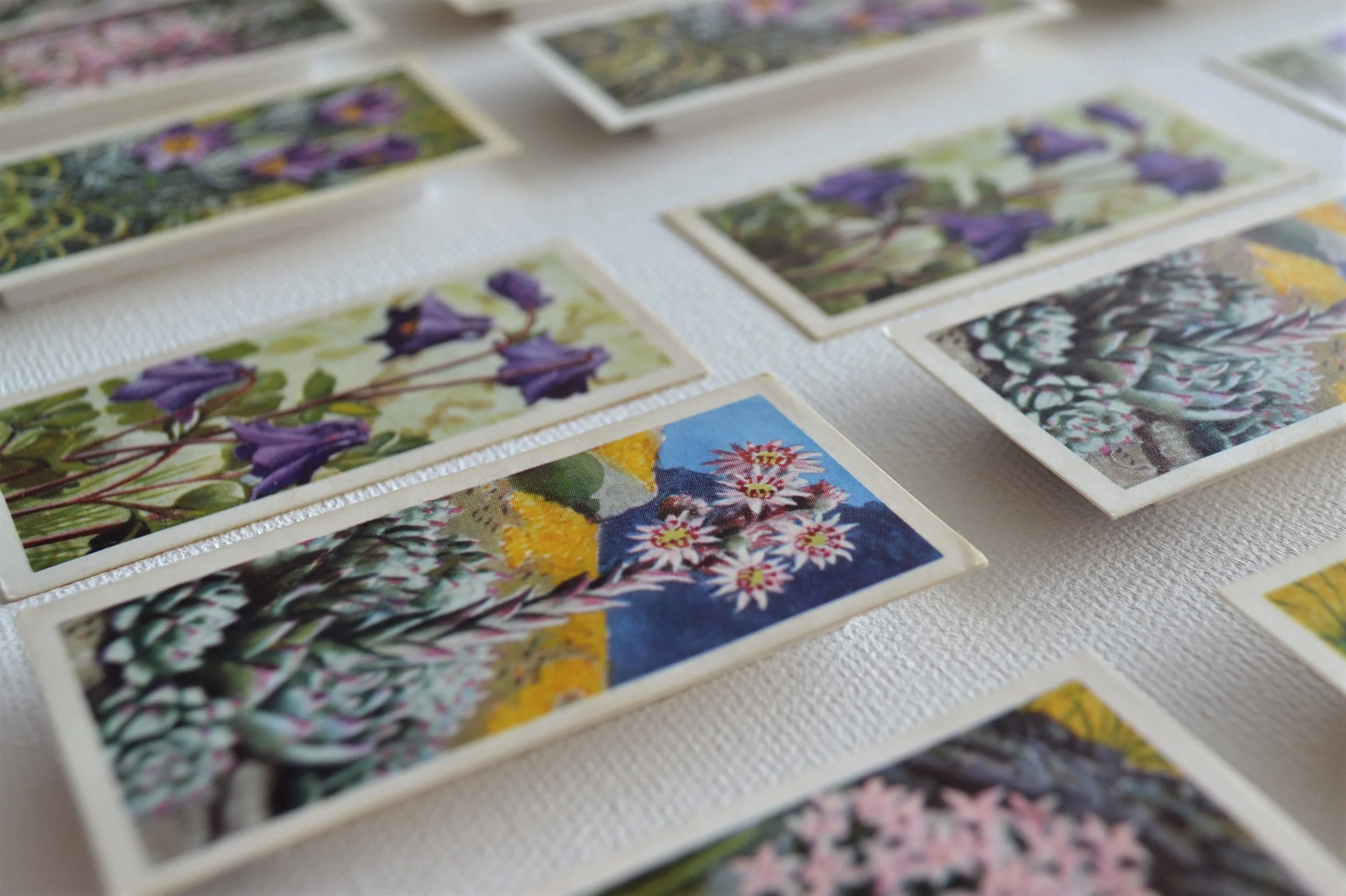 The individual history of each card is evident in the marks, creases or worn edges and the general aesthetic of the illustrations is typical of mid-century graphic design.