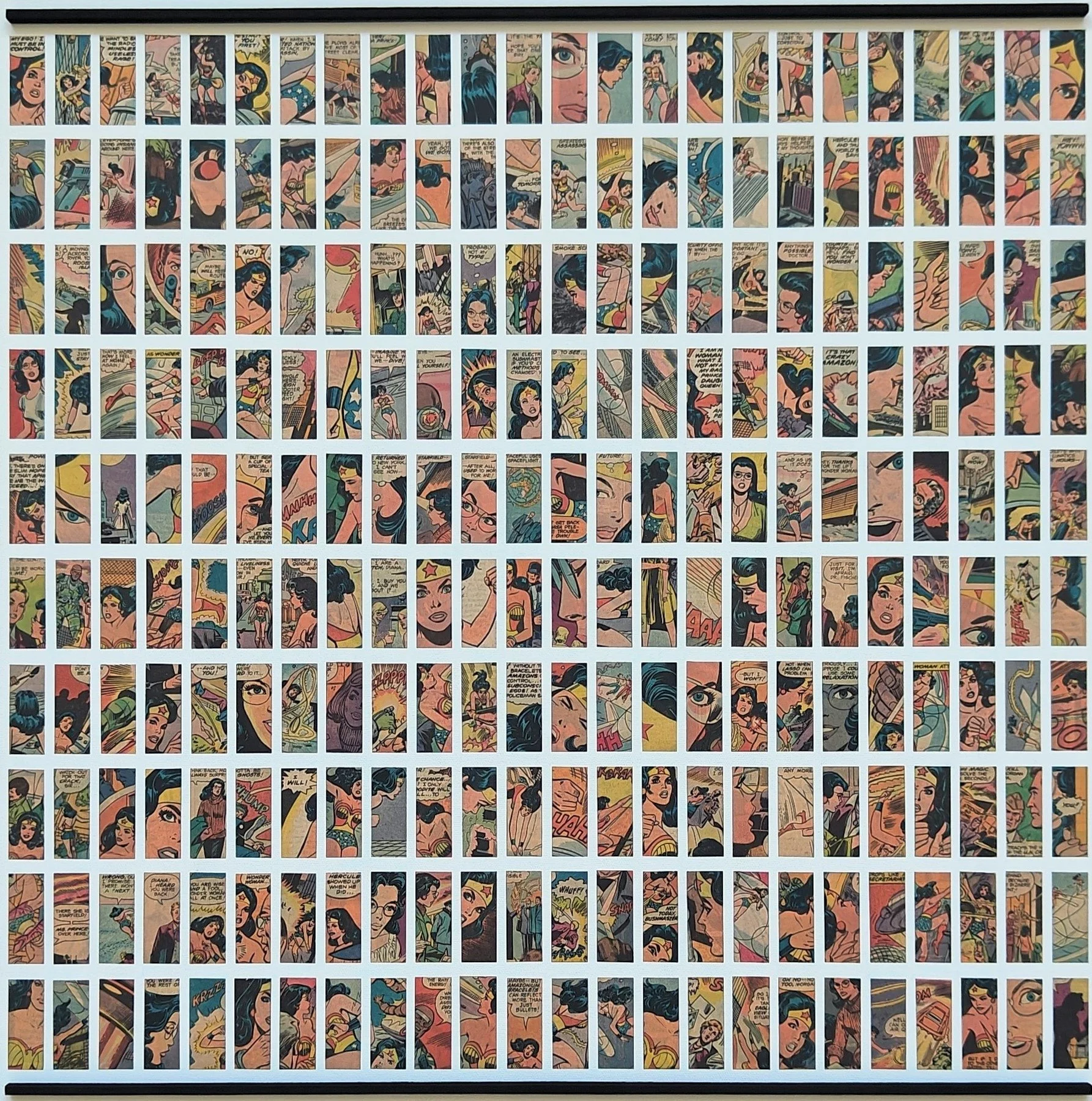 Using three, original Wonder Woman comics from 1979, small sections have been cut from the pages and laid out to form a vibrant pattern housed within a strong geometric shape.